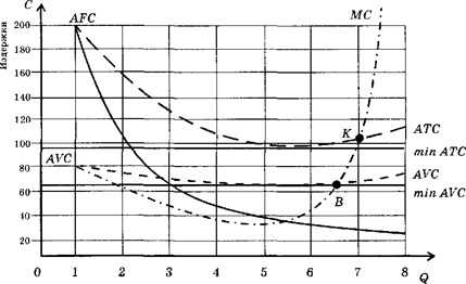 Остановимся вначале на характере кривых, изображенных на рис. 7.3. Так как при принятии решений фирмой наиболее важными являются характеристики в расчете на единицу изделий, то рассмотрим данные по средним величинам различных издержек. Постоянные издержки на единицу продукции, т.е. удельные постоянные издержки, по мере наращивания выпуска продукции падают, так как их абсолютная величина неизменна. На практике их величина может претерпевать небольшие изменения. Так, с ростом производства могут увеличиться расходы на охрану в связи с ростом риска хищений. Сложнее зависимость переменных издержек в функции роста производства. На первом этапе кривая AVC показывает уменьшение удельных переменных издержек: сказывается эффект масштаба, увеличения объема производства. Но затем удельные переменные издержки начинают расти: над эффектом масштаба берет верх действие закона убывающей отдачи. Например, на машиностроительном предприятии работа в три полных смены может привести к снижению отдачи оборудования, так как выпуск продукции в третью смену исключает возможность профилактических работ, что неизбежно приведет к простоям машин и оборудования. Что касается кривой совокупных издержек (АТС), то она падает быстрее, чем каждая из ее составляющих (AFC и AVC), что вполне закономерно.