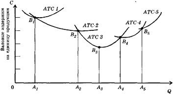 На рис. 7.4 ординаты А1 – B1 А2 – В2 и последующие выражают величины валовых издержек при наращивании производственных мощностей фирмы. Нетрудно видеть, что они минимальны в третьем варианте, а затем начинают возрастать. Реальная динамика валовых издержек при увеличении производственных мощностей будет выражена кривой B1B2B3B4B5, которая представляет ломаную кривую, каждый из элементов которой корреспондирует определенному этапу наращивания мощностей фирмы. Вместе с тем, данная кривая - кривая выбора фирмы. Изменилась ситуация на рынке - необходимо принимать новое решение: увеличивать или уменьшать мощности