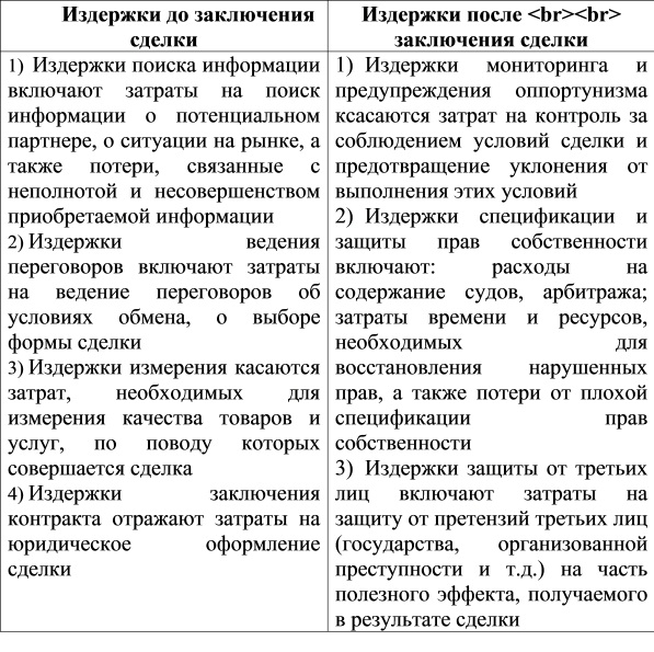 Трансакционные издержки можно классифицировать в зависимости от этапов заключения сделки.