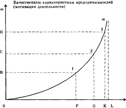 В соответствии с иерархией предпринимателей кривая разбита на четыре части, первая из которых — 01 — соответствует первой, наибольшей по численности группе предпринимателей, обладающих самыми низкими предпринимательскими качествами. По мере приближения к четвертой части кривой - 3°°, относящейся к последней, высшей (суперэлитной) группе предпринимателей, - происходит постепенное уменьшение численности групп с одновременным резким возрастанием качественного уровня предпринимателей и изменением мотивов их деятельности.