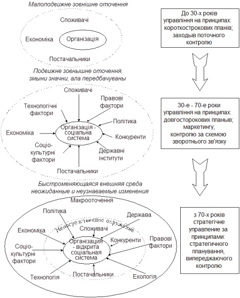 Ще 30 років тому у практиці управління були відсутні стратегічні принципи. Тільки у 60-70 рр. з’являються нові методи управління, що безпосередньо пов’язано і з еволюцією представлень про зовнішнє оточення. Зараз менеджмент намагається забезпечити ефективну взаємодію організації з оточенням не тільки шляхом впливу на процеси, що відбуваються усередині організації, але і шляхом впливу на навколишнє середовище. Для рішення цих задач використовуються прийоми стратегічного управління (рис.2.2).