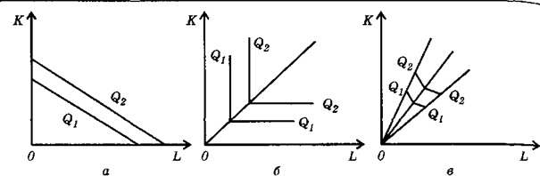 Изменение соотношения между используемыми факторами производства отражается движением по каждой изокванте. Один фактор замещает другой при создании определенного объема продукта. Это принято называть «замещением», а наклон изокванты - «предельной нормой замещения». Понятно, что изокванты могут иметь самые разнообразные формы: прямая линия (совершенная замещаемость; постоянная норма замещаемости); два отрезка, соединенные вместе под прямым углом; несколько отрезков, соединенных под тупыми углами, и т.п.