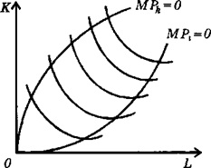Обратимся еще к одному существенному моменту. До сих пор, когда речь шла об изоквантах, мы не ставили вопроса об их границах. Это означало, что теоретически у изоквант не существует границ. Безусловно, это так. Но предпринимателя интересует не вся длина изокванты, а лишь тот ее участок, на котором предельные продукты каждого из ресурсов остаются положительными, хотя и убывают. Все точки на изоквантах, отражающие нулевые предельные продукты, образуют границы эффективной области изоквант (рис. 7.2).