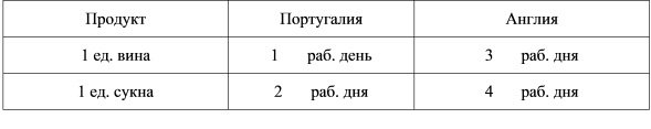 Для иллюстрации используем условный пример. Рикардо для простоты брал две страны: Англию и Португалию - и два товара: вино и сукно. Издержки производства он условно измерял рабочим временем: