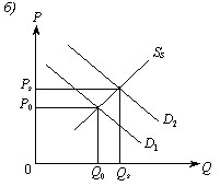 На рис. 9.1в показано, що результатом буде зниження ціни — з Ps до Pi і до P0 і велика зміна пропонованої продукції (з Q0 до Qi і до Q?i) як реакція на розширення попиту. Останнє свідчить, що затрати праці та витрати виробництва знизилися до вихідного пункту, яким є ціна P0, хоча масштаби виробництва, пропонування і попиту збільшилися.