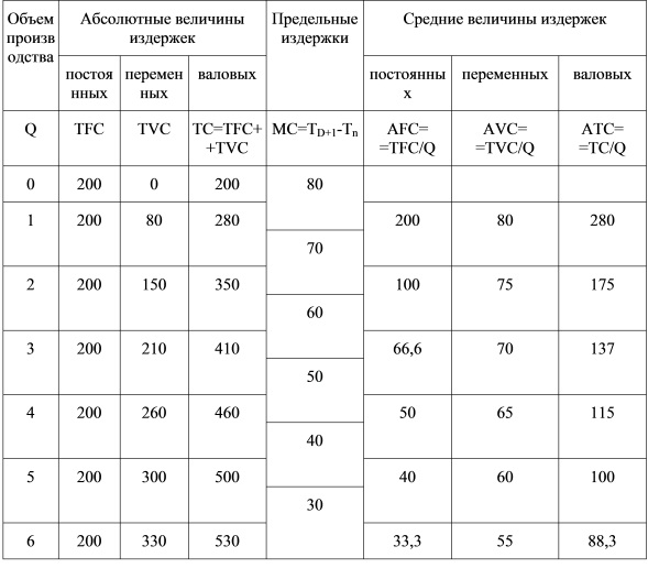 Таким же образом рассчитываются средние постоянные и переменные издержки. Так как целью функционирования фирмы является максимизация прибыли, то предметом расчетов выступает объем производства, что, в свою очередь, вызывает необходимость использования категории предельных издержек. Предельные издержки - это издержки на производство каждой дополнительной единицы продукции относительно фактического или расчетного объема производства. Соотношения между различными видами издержек видны на следующем числовом примере (табл. 7.1).