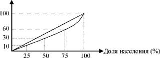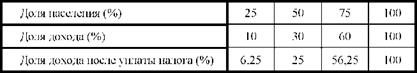 В деревне живут 4 семьи, то есть каждая из них составляет 25% от населения, две семьи - 50%, три семьи - 75% и т. д. Определим долю доходов одной, двух, трех семей, если общий доход равен 10000+20000+ +30000+40000=100000 или 100%. Данные сведем в таблицу.