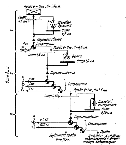 Обработка проб заключается в чередующихся операциях дробления, грохочения (просеивания), перемешивания и сокращения исходной пробы. Сокращение должно быть выполнено так, чтобы содержание полезного компонента в уменьшенной пробе соответствовало его содержанию в начальной. Для этого пробу измельчают, тщательно перемешивают, а затем сокращают. Обычно процесс обработки пробы включает несколько этапов (стадии). На каждой стадии материал пробы дробится до кусков определенного размера и сокращается. Размер кусков в каждой стадии обработки контролируется путем просеивания материала пробы через стандартные сита. Для сохранения представительности пробы необходимо соблюдение пропорций между размерами частиц и оптимальной массой сокращенной пробы, что проверяется с помощью формулы Ричардса-Чечотта .Q=kd2 (Q—масса пробы после ее сокращения, кг; k.—коэффициент, определяющий характер оруденения по степени его неравномерности; d—диаметр частиц максимальной фракции пробы, мм). (Г.О.Чечотт – профессор ЛГИ) Значение коэффициента k зависит от характера распределения металла в руде и колеблется от 0,05 (равномерное распределение) до 1 (крайне неравномерное). В большинстве случаев величина коэффициента k для рудных месторождений равна 0,5. На основании рассчитанного коэффициента k. разрабатывается схема обработки пробы. На рис.6 приведен пример такой схемы.