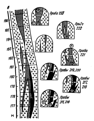Бороздовый способ. Наиболее распространенный способ опробования. В пробу отбирается материал, который вырезается или вырубается в виде борозды, вытянутой по линии наибольшей изменчивости состава и строения рудной залежи или близком, к этому направлению. В подземных горных выработках, как правило, борозды опробования располагают вертикально (для полого залегающих рудных тел) или горизонтально (для крутопадающих), что соответствует вертикальным или горизонтальным разведочным сечениям рудного тела. Обычно придерживаются следующих правил: при опробовании забоя проба отбирается горизонтальной или вертикальной бороздой; в случае опробования в горизонтальных секущих горных выработках (квершлагах, ортах, заходках) борозды отбираются непрерывной цепочкой от лежачего до висячего бока обнаженной залежи; при опробовании кровли (если не были опробованы забои) — горизонтальные борозды и т.д. Для выявления различных сортов руд часто проводят секционное бороздовое опробование. Секционный отбор проб в разведочных пересечениях производится: для оконтуривания рудных тел при постепенном переходе руды во вмещающую породу; для раздельного изучения слагающих залежь природных типов или разновидностей полезного ископаемого; для изучения внутренней изменчивости мощных и внешне однородных тел полезного ископаемого.