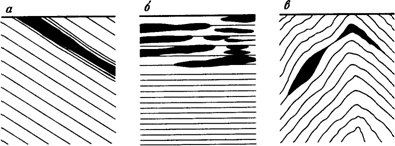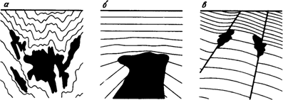 К жилообразным рудным телам относятся: жилы (рис. 3, а) характеризуются несложной формой без разветвлений и резких изменений. мощности и залегания (кварцевые, кварц-вольфрамитовые и др ). ветвящиеся, или сложные, жилы - обычная форма рудных тел многих золоторудных, меднорудных, оловорудных, вольфрамовых и других месторождений (рис. 3, б), прожилковые зоны и штокверки - широко распространенная в природе форма рудных тел многих крупных месторождений меди, свинца, цинка, золота и редкихметаллов. В отличие от простых и сложных жил прожилковые зоны характеризуются большим числом мелких жил или прожилков (рис.3, в).
