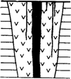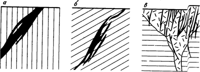 Рис.3 Рудные тела жилообразной формы во вмещающих породах: а - простая жила; б - ветвящаяся жила; в - прожилковая зона (штокверк)