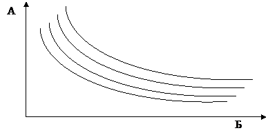 Карта безразличия – это совокупность кривых безразличия по отношению к товарам А и Б, изображенных на одной координатной плоскости (см. рис. 2). Считается, что полезность увеличивается, когда кривая безразличия сдвигается вправо и вверх.