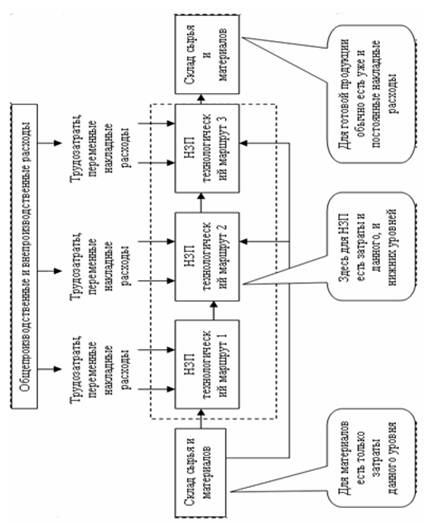 Затраты, которые предприятие осуществляет в процессе изготовления продукции, «присоединяются» к ней на протяжении этого процесса формирование затрат по изделию с течением времени производственного процесса и в разрезе структуры продукта проиллюстрировано рис.