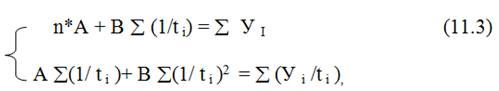 Если теоретическая линия регрессии – гипербола вида У i = А + В / t i, то коэффициенты регрессии А и В определяют из системы уравнений: