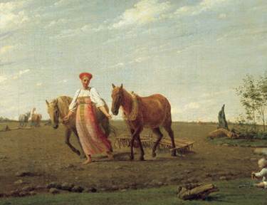 В "Весне" Венецианова аллегория очень естественно завуалирована в бытовой сцене. Крестьянская девушка, ведущая под уздцы лошадок, тАФ это аллегория весны. Она выше коней. Ступает она очень легко, едва касаясь земли. Она почти парит над землёй, обе руки немного расставлены, как будто в лёгком полёте. И дитя на полянке, и молодые деревца тАФ это символы рождения, обновления, прихода новой жизни. Всё это говорит нам, что с весною пришла новая жизнь, новые заботы и радости тАФ и это прекрасно! А весна для крестьянина связана с посевной, с работой на пашне, и Венецианов очень умно, тактично связал пору весенней трудовой деятельности человека на земле с идеей вечного обновления жизни. Прекрасная картина, вся пронизанная солнцем, ощущением счастья, радости бытия и труда.