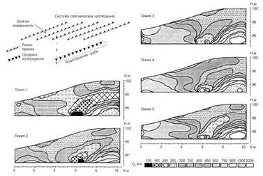 Обработка сейсмической информации проведена в интерактивном режиме в сиc теме Windows XP. Первичная обработка сейсмических материалов заключалась в построении для каждого профиля системы годографов волн, регистрируемых в первых вступлениях, прежде всего годографов продольных рефрагированных волн при наблюдениях по системе Z-z и годографов поперечных (типа SH) рефрагированных волн при наблюдениях по системе Y-y. Сейсмотомогра-фические преобразования выполнены после ввода кинематических и фазовых поправок, включая корректировку фазы, обусловленной изменением преобладающей частоты регистрируемых упругих колебаний в зависимости от расстояния возбуждения - прием. В программном сейсмотомографическом комплексе (автор В. Н. Курбатский) реализован алгоритмический аппарат лучевой сейсмотомографии, обеспечивающий в автоматическом режиме итерационный подбор скоростной модели среды при выполнении условия минимизации разности времен между наблюденными и теоретическими годографами во всех точках наблюдения. Общее решение задачи сводится к решению системы линейных уравнений с большим количеством неизвестных, которое достигается способом алгебраической реконструкции [1].