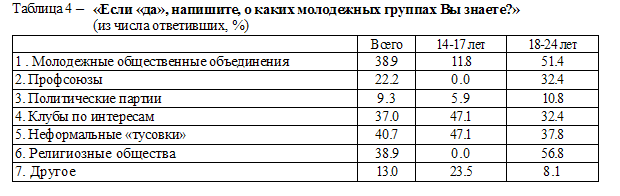 Из таблицы видно, что юные граждане более информированы в данном вопросе, среди них меньше таких кто не смог ответить на вопрос. ВлОсведомленностьВ» имеет свою специфику, связана с возрастом: о молодежных общественных объединениях, например, знает каждый второй молодой человек в возрасте 18-24 лет. Только в этой возрастной группе было высказано мнение о существовании религиозных объединений (56,8%) и профсоюзов (32,4%), что может косвенно подтверждать наличие других интересов и проблем (см. таблицу 4). Кроме того, в этом возрасте в большей степени проявляется
