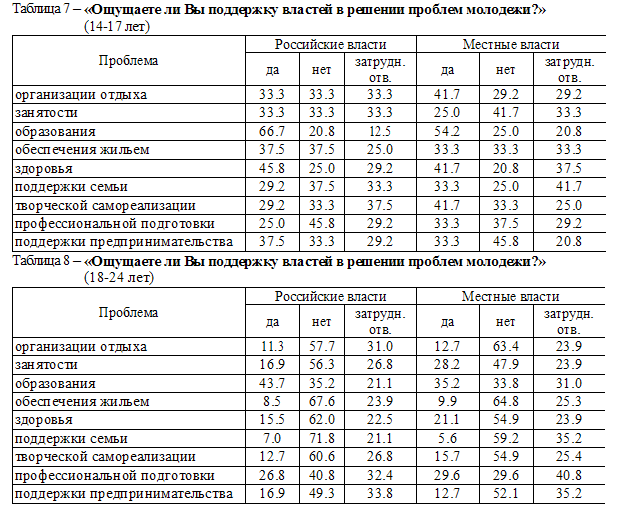 Вопросы отдыха, здоровья, творческой самореализации на этом уровне власть как-то еще пытается держать на контроле. В отсутствии стратегических программ (и осведомленности о существовании подобных) молодые люди акцентируют внимание в основном на решении сиюминутных вопросов. ВлВиноватВ» в этом, как нам кажется, не только возраст, который определяет ориентиры и кредо большинства, но и желание власти быть услышанной (см. таблицы 7, 8).