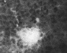 Рис.1. Островки клеток, сохранивших эмбриональные белки (светлые клетки, выявленные с помощью иммунофлюоресцентной техники), в печени взрослой мыши. Препарат получен в 1971 г. в лаборатории Л.И.Корочкина в Новосибирском институте цитологии и генетики СО АН СССР.