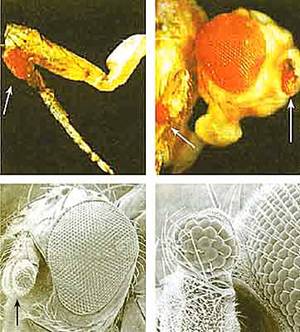 Использование стволовых клеток в биологии развития позволило подтвердить существование генов-господ, запускающих каскады генов, от которых зависит специализация целых органов, зародышевых листков и отдельных типов клеток. Эта универсальная закономерность присуща всем животным. Так, у дрозофилы есть ген eyeless (безглазости), который обусловливает развитие глаза. Если его заставить работать в необычном месте, то глаза могут появиться на брюхе, на лапках, на крыле и в любом другом месте (рис.3). Сходный ген Pax6 есть и у млекопитающих. Введенный в геном дрозофилы, он дает тот же эффект, что и собственный ген хозяина. Все это свидетельствует об универсальности эффекта генов-господ.