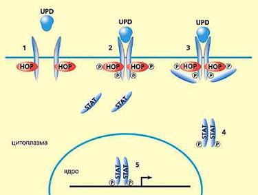 Одна из важнейших общебиологических проблем, решить которую помогут стволовые клетки, тАФ генетический механизм поддержания детерминированного состояния в ходе деления клеток и выхода их в дифференцировку. Всерьез ее поставил еще Э.Хадорн в 50-е годы прошлого века, но до сих пор она не решена. Недавно удалось пролить некоторый свет на молекулярно-генетические события при переходе клетки из детерминированного состояния в дифференцировку. Наша соотечественница Наталья Тулина, работающая в США, заметила, что для такого перехода очень важно взаимоотношение стволовых клеток с клетками-ВлнишамиВ», к которым они ВлприлежатВ». Так, в семенниках дрозофилы соматические клетки ВлхабаВ», формирующие нишу стволовых клеток, содержат белок UPD, который, в свою очередь, активирует так называемый сигнальный каскад Jak-STAT. Усиленный синтез UPD в клетках апикального района семенников приводит к росту и репродуктивных, и стволовых клеток семенника. Для поддержания обоих типов клеток необходимо участие компонентов Jak-STAT сигнального каскада, киназы НОР и транскрипционного активатора STAT92E. Активацию всего комплекса белков запускает UPD, который клетки-ВлнишиВ» передают стволовым клеткам. Разрыв связи между ними обусловливает начало дифференцировки стволовых клеток (рис.4). Насколько универсален этот механизм, предстоит еще выяснить.