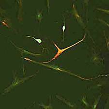 Обнаружить стволовые клетки можно с помощью специальных методов. Дело в том, что в ВлнативныхВ» стволовых клетках и их производных синтезируются специфические белки, которые выявляются с помощью иммуногистохимической техники. На каждый белок получают антитела, которые метят флюоресцирующим красителем. Такой реагент выявляет белки, присутствующие в стволовых клетках на разных стадиях развития. Так, нейральные стволовые клетки содержат белок нестин (рис.2). Когда они вступают на путь специализации, в них появляется новый белок тАФ виментин. Если клетки развиваются в нейральном направлении, то синтезируются соответствующие маркирующие белки тАФ нейрофиламентные, b3-тубулин, энолаза и др. Когда клетки специализируются как вспомогательные, глиальные, появляются другие маркеры, например глиальный фибриллярный кислый белок, белок S-100 и др.