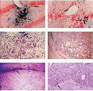 Рис.7. Трансплантация клеток дрозофилы в мозг крысы (ксенотрансплантация). а, б тАФ меченые клетки дрозофилы (стрелки) в мозге крысы; в тАФ аллотрансплантат эмбриональной нервной ткани крысы в сочетании с ксенотрансплантатом (стрелка); г тАФ стимуляция роста кровеносных сосудов ксенотрансплантатом; д тАФ рубцовая ткань (стрелка) на границе аллотрансплантат/ткань хозяина; е тАФ добавление ксенотрансплантата к аллотрансплантату блокирует образование рубца.