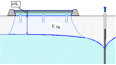 Создание искусственных запасов (применяется также термин "магазинирование") производится один или несколько раз в году путем единовременного затопления больших площадей вблизи водозаборного сооружения (естественные понижения, специально обвалованные участки пойм, террас..); обычно предварительно производится зачистка слабопроницаемого почвенно-растительного слоя. Полное насыщение пород в зоне аэрации над депрессионной воронкой (рис.6.7) происходит достаточно быстро: