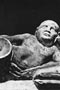 Проблема происхождения скульптурного портрета Этрурии тесно связана с религиозными воззрениями древних этрусков. Религия этого загадочного народа древней Италии, как и его происхождение, история и культура в целом, известна еще недостаточно. О том, что в религии этрусков культ мертвых играл чрезвычайно большую роль, свидетельствуют роскошные гробницы, снабженные богатыми погребальными дарами. Важное место в культе мертвых, несомненно, занимала идея [с.11] сохранения внешнего облика умершего, может быть, как залога его потустороннего бессмертия (по аналогии с религией Древнего Египта). У этрусков уже в раннее время вместилище праха умершего тАФ урна, хранившая пепел сожженного тела, снабжалась изображением человеческого лица. Много подобных урн найдено на некрополе одного из крупных центров Этрурии тАФ Кьюзи. Древнейшие урны из Кьюзи имеют форму сосуда, закрытого круглой крышкой. Они изготовлялись из бронзы и глины. Уже в VIII-VII веках до н.э. крышки украшались масками, схематично и примитивно передающими человеческое лицо. Незначительное число таких бронзовых масок сохранилось до наших дней тАФ примером их служит маска из Кьюзи первой половины VII века до н.э.