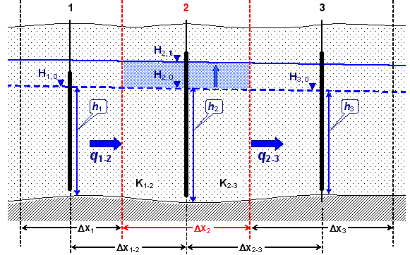 | Рис. 1. К обоснованию методики оценки интенсивности инфильтрации по данным режимных наблюдений на створе скважин в линейном потоке |