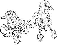 Рис. 3. Суточные гусята с втянутым (норма) и невтянутым (нарушение) желтком.