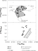 На рисунке 8 внутри поля изотопных данных Камчатки выделяется три тренда, что предполагает участие трех компонентов в генезисе пород. От поля MORB, характеризующегося 87Sr/86Sr < 0.7031 и 143Nd/144Nd