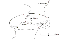 Сохранившийся в практически не измененном состоянии фрагмент обломочной лавины (рис.7) позволяет судить о характерных особенностях первичного мезо- и микрорельефа ее поверхности. Специфическая особенность холмисто-котловинного и холмисто-грядово-котловинного рельефа поверхности этого фрагмента грубообломочной обвальной лавины с "сетчатым" микрорельефом по Т.С.Краевой [10] - его схожесть с рельефом глыбовых лавовых потоков. Холмы и короткие грядки объединены здесь в некое подобие извилистых валов, ориентированных перпендикулярно к направлению движения материала. Так же ориентированы и разделяющие их извилистые ложбины - зоны разрыва. Местами хорошо видны обособленные, как бы отдельные, потоки (или струи) шириной в несколько сот метров и длиной 1-2 км, "текущие" вниз по склону вулкана, куда двигался и остальной материал обвальной лавины. Все эти признаки свидетельствуют, что здесь, на периферии обвальной лавины, обломочный материал еще продолжал перемещаться, но уже с небольшой скоростью. Указанием на малую скорость движения обломочной лавины служит и то, что в ее прифронтальной области имеются много невысоко поднимающихся над поверхностью лавины выступов подстилающего рельефа с сохранившейся древесно-кустарниковой растительностью. Относительные превышения вершин холмов и гряд над дном ложбин колеблются от нескольких до 10-15 м. Высота фронта обвальной лавины над подстилающей поверхностью - 3-5 м.
