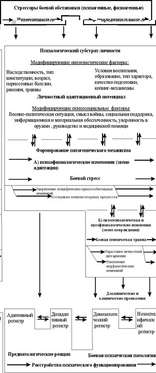 Таким образом, боевая психическая травма представляет собой патологическое состояние ЦНС, формируемое в результате боевого стресса, превысившего адаптационный потенциал конкретной личности, и образующее pathos боевой психической патологии. Сущность БПТ состоит во включении патофизиологических механизмов регуляции гомеостаза, накоплении морфологических изменений в структурах ЦНС, нарастании специфической личностной дисгармонии и готовности к психопатологическому синдромообразованию. Связанные с БПТ функциональные нарушения (боевые стрессовые расстройства) включают широкий спектр состояний дезинтеграции психической деятельности тАУ от кратковременных дизадаптивных реакций предпатологического, предсиндромального регистра до устойчивых, нозологически сложившихся болезненных процессов.
