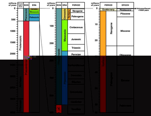 This gelogical time scale is based upon Harland et al., 1990, but with the Precambrian/Cambrian boundary modified according to the most recently-published radiometric dates on that interval, revising the boundary from 570+-15 million years to 543+-1 million years ago (Grotzinger et al., 1995). Other changes have been proposed since 1990 (e.g., revision of the Cretaceous by Obradovich, 1993), but are not incorporated because they are relatively small.