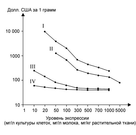 Рис. Динамика цены за 1 грамм рекомбинантного IgA, полученного из разных экспрессирующих систем в зависимости от уровня экспрессии. I - культура клеток млекопитающих; II - молоко трансгенной козы; III - трансгенные растения (семена); IV - трансгенные растения (зелёная биомасса) (По: Daniell et al., 2001).