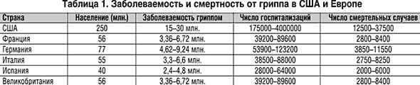 По данным ВОЗ, от ОРВИ и их осложнений ежегодно умирает 4 млн. детей в возрасте до 5 лет, причем доля детей до 1 года среди умерших составляет более 66%. В 75% случаев причиной детской смертности от ОРВИ является острая пневмония [3]. В США смертность от гриппа и его осложнений составляет ежегодно в среднем 20 тыс. человек, при этом 80тАУ90% летальных исходов отмечается в возрастной группе старше 64 лет [4]. В таблице 1 приведена статистика годовой заболеваемости и смертности от гриппа в зарубежных странах.