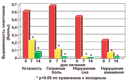 В процессе лечения у больных АР отмечалось уменьшение назальных (зуда в носу, чихания, ринореи, заложенности носа), глазных (слезотечения, зуда, гиперемии) и кожных симптомов (рис. 1, 2, 3). У пациентов снижалась выраженность общих симптомов, характеризующих качество жизни (рис. 4). Лечебный эффект препарата был отчетливо представлен на 7 день и нарастал к 14 дню его приема.
