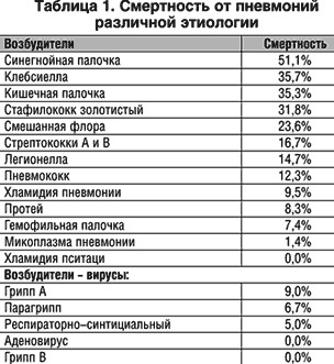 Смертность от внебольничных пневмоний составляет 5%, но у пациентов, нуждающихся в госпитализации, она доходит до 21,9%, от нозокомиальных тАУ 20%, у пожилых больных тАУ до 46%. До применения пенициллина смертность от пневмококковой пневмонии с бактериемией составляла 83%. В таблице 1 приведены показатели смертности от пневмоний, вызванных различными возбудителями.