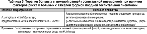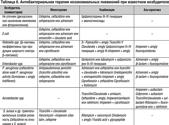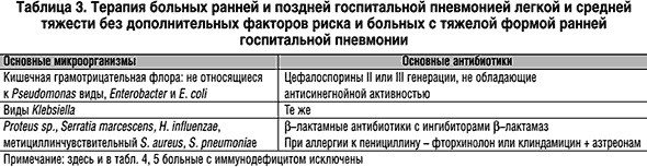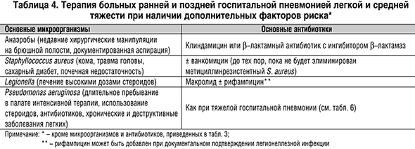 С учетом тяжести пневмонии, сроков начала (до или после 5 дней пребывания в стационаре) и наличия факторов риска эмпирическое назначение антибиотиков может быть детализировано (табл. 3,4,5,6).