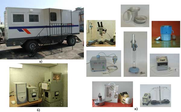 а) вагон-прицеп; б) блок газового анализа; в) геологические приборы.