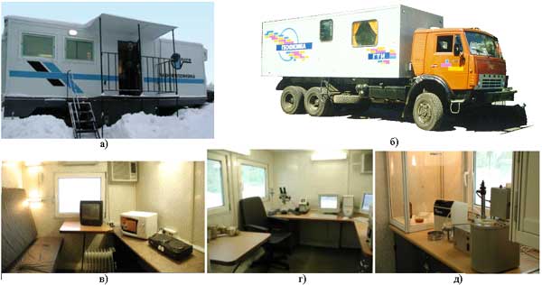 а) станция - вагон-прицеп; б) станция на шасси КАМАЗа; в) бытовой отсек; г) аппаратурный отсек; д) геологический блок.