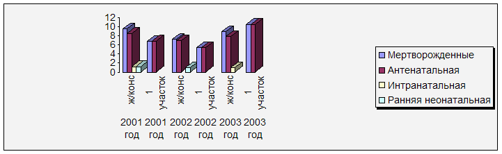 При анализе представленной таблицы видно, что показатели перинатальной смертности на моём участке в 2001 и 2002 году ниже, чем по женской консультации, а в 2003 году практически равнозначны с показателями женской консультации. Следует отметить, что показатели перинатальной смертности по Тюменской области за 2003 год лишь незначительно ниже (9,2тА°). К сожалению, данные по РФ доступны только за 2001 год, и можно отметить, что эти показатели выше данных по женской консультации и моему участку (12,9тА° по РФ; 10,7тА° по женской консультации и 6,84тА° по 1 участку)
