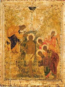 Крещение, которым крестил Иоанн, было Крещением покаяния. Вода крещения была очищением, избавлением человека. Христос не имел нужды в таком Крещении, будучи чист изначала, и лишь по смирению принял Крещение от Иоанна, но, приняв на Себя Крещение водою, Спаситель не освятился водами, в чем не было нужды, но освятил Собою водное естество и с ним весь мир. Крещением от Иоанна, действием предельного смирения Христова, открылось Его Божество, как Единого от Троицы, во всем неразлучного с Отцом и Святым Духом.
