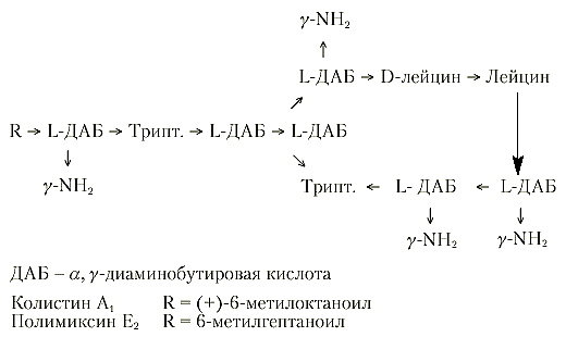 Все полимиксины воздействуют на цитоплазматическую мембрану бактериальной клетки, взаимодействуя с фосфолипидами. Они связываются с анионными участками мембраны и по характеру действия напоминают катионные детергенты. Повреждение структуры мембраны приводит к изменению ее проницаемости как для внутри-, так и внеклеточных компонентов [ 44, 66].