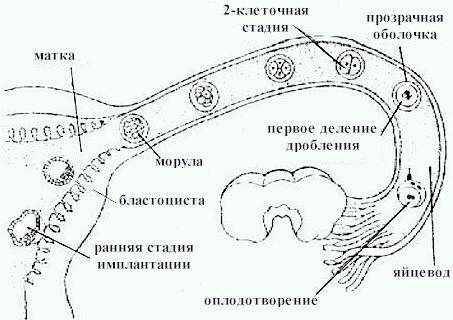 Оплодотворение обычно происходит в ампулярном отделе маточной трубы, обращенной к яичнику. Благодаря ритмичным сокращениям маточных труб оплодотворенная яйцеклетка продвигается в полость матки. Во время продвижения по маточной трубе яйцеклетка превращается в многоклеточный зародыш (плодное яйцо), густо покрытый нежными ворсинками тАФ с их помощью он прикрепляется к слизистой оболочке матки. При заболеваниях маточных труб в них возникают изменения, препятствующие продвижению оплодотворенной яйцеклетки, она может прикрепиться в маточной трубе.