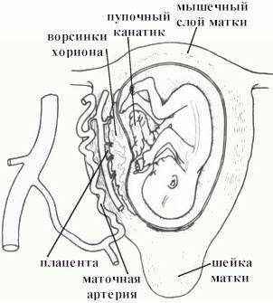 С момента прикрепления к слизистой оболочке матки начинается формирование сначала зародыша, потом плода и интенсивная перестройка функций некоторых систем организма беременной. Этим объясняется изменение ее самочувствия (тошнота, головокружение и др.), возникающее иногда в первые недели беременности. На месте прикрепления зародыша ворсинки пышно разрастаются; из них образуется так называемое детское место, или плацента, соединенная с плодом посредством пуповины. Через плаценту от матери по кровеносным сосудам пуповины поступают к плоду питательные вещества и кислород, удаляются продукты обмена.