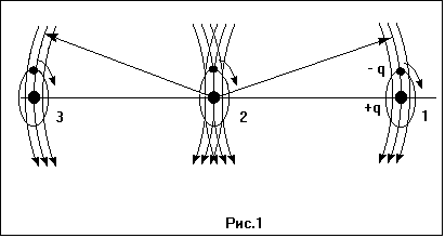 На рисунке рис.1 показана устойчивая группа из трех излучающих электрических диполей, которые равномерно и совместно вращаются вокруг общей оси (отрицательный заряд вокруг тяжелого положительно заряженного тела), и фрагменты электрических полей, излученных ранее соседними диполями. Чтобы не загромождать рисунок, показаны лишь участки электрического поля, параллельные плоскости рисунка, и лишь вблизи диполей. Диполи занимают в полях друг друга устойчивые положения, т.к. находятся в максимумах электрического поля, как в потенциальных ямах, вращаются вместе с полем, и их подвижные заряды всегда смещены вдоль поля к нижнему энергетическому уровню в нем. Будучи выведены из устойчивых положений, диполи вернутся в них или придут к новым устойчивым положениям.