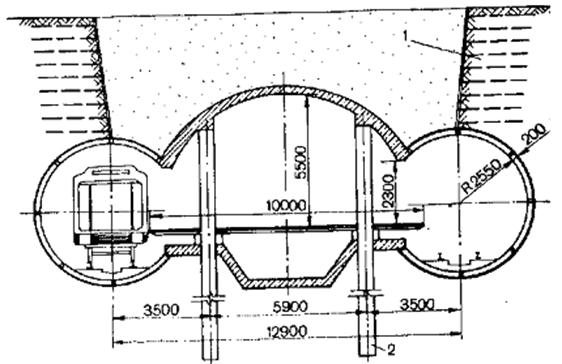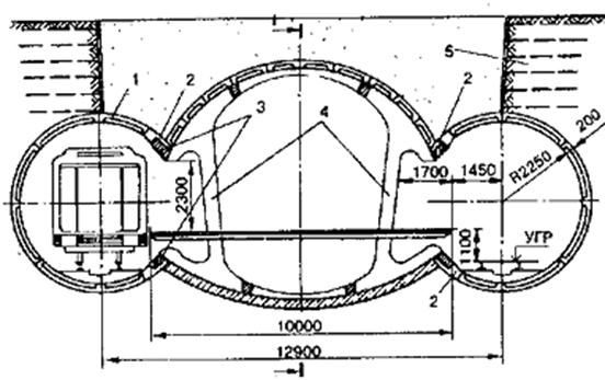 1 тАФ путевые тоннели; 2 тАФ замкоВнвые элементы обделки; 3 тАФ отметка, соответствующая низу перекрытия станции; 4 тАФ сваи-колонны;