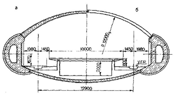 Котлован между тоннелями разрабатывают вдоль оси станции захватками по 20-30 м. На этих участках по мере углублен котлована демонтируют тюбинги временного заполнения кольца, в створе с которым будут расположены жесткие замкнутые рамы. Дойдя до отметки лотка станции, бетонируется обратный свод. Затем поперек станции устанавВнливают жесткие замкнуВнтые рамы так, чтобы конВнсольные части ригелей заВншли в прорези, образовавВншиеся при демонтаже коВнлец, под балки-перемычки. Стыки элементов рам омоноличивают. По рамам укладывают плиты переВнкрытия и производят обратную засыпку. Только после обратной засыпки демонтируют оставленные между рамами тюбинги временного заполнения обделки путевых тоннелей. Новые возможности для выбора оптимальных конструктивных и техноВнлогических решений при полузакрытом способе сооружения станции отВнкрываются при использоВнвании конструктивной схеВнмы односводчатой станВнции, обделка которой представляет собой поВнлогие верхний и обратный своды, опирающиеся на массивные опоры кругоВнвого очертания. В определенных условиях обратный свод может быть заменен лотковой плитой. Полые опоры свода выВнполнены из монолитного бетона в тоннелях, пройденных перегонными щитовыми комплексами. На рис. 2.7 представлены варианты такой конВнструкции с монолитным (а) и сборным (б) исполнеВннием верхнего свода.